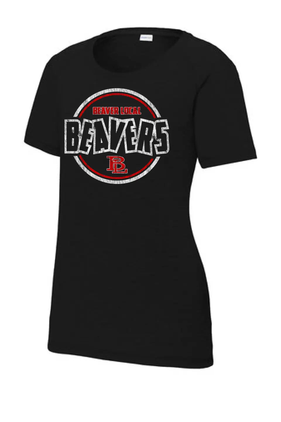 Beaver Local 2023-13 Distressed Ladies PosiCharge Tri-Blend Wicking Scoop Neck Raglan Tee