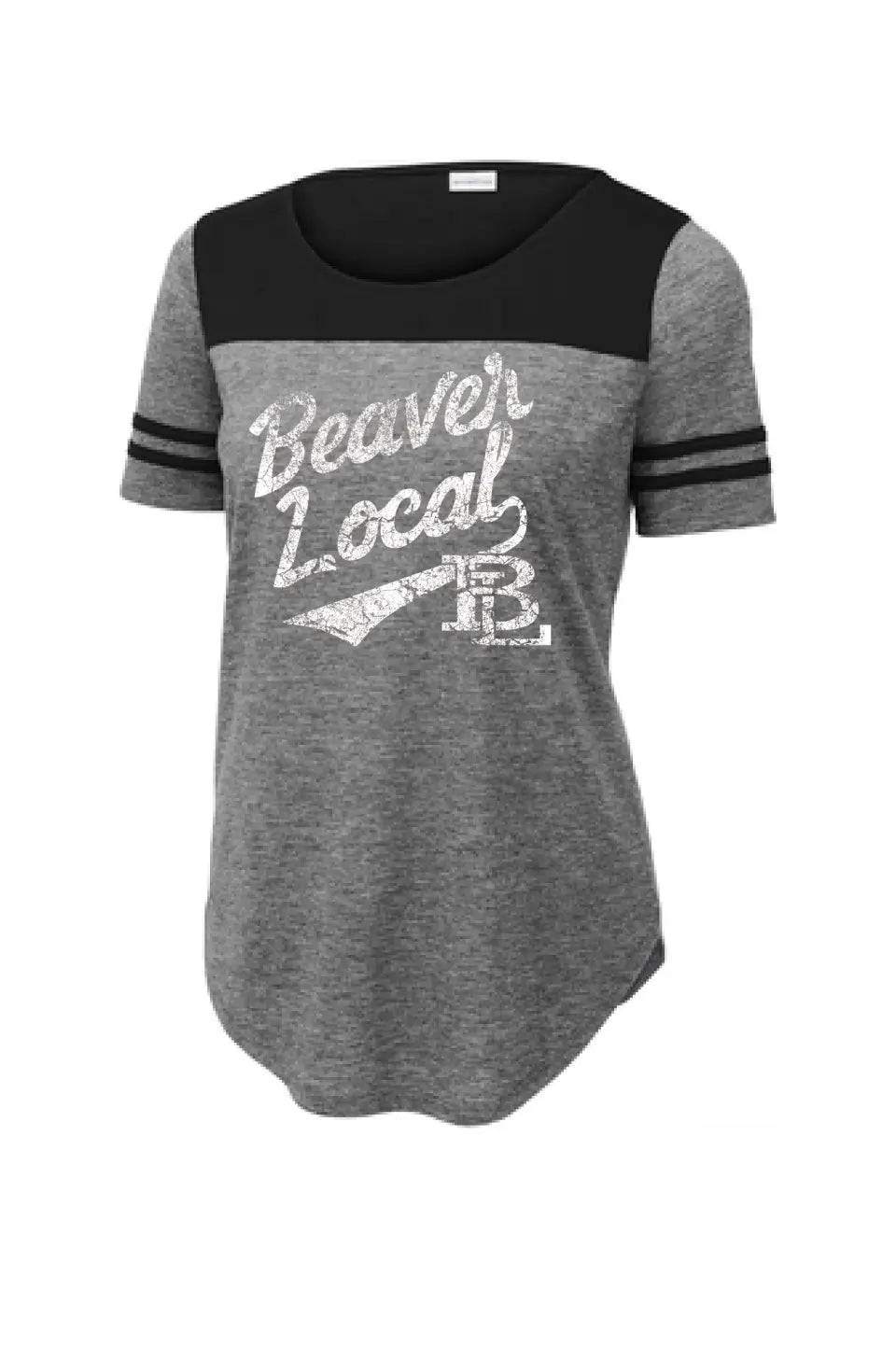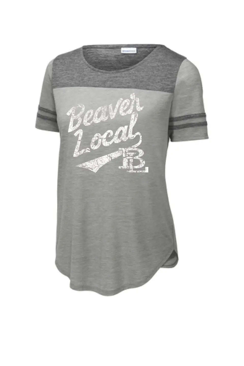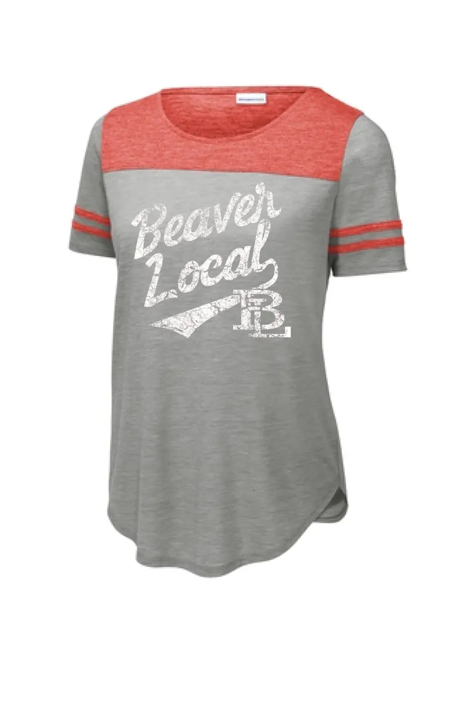 Beaver Local Script Distressed Ladies PosiCharge Tri-Blend Wicking Fan Tee