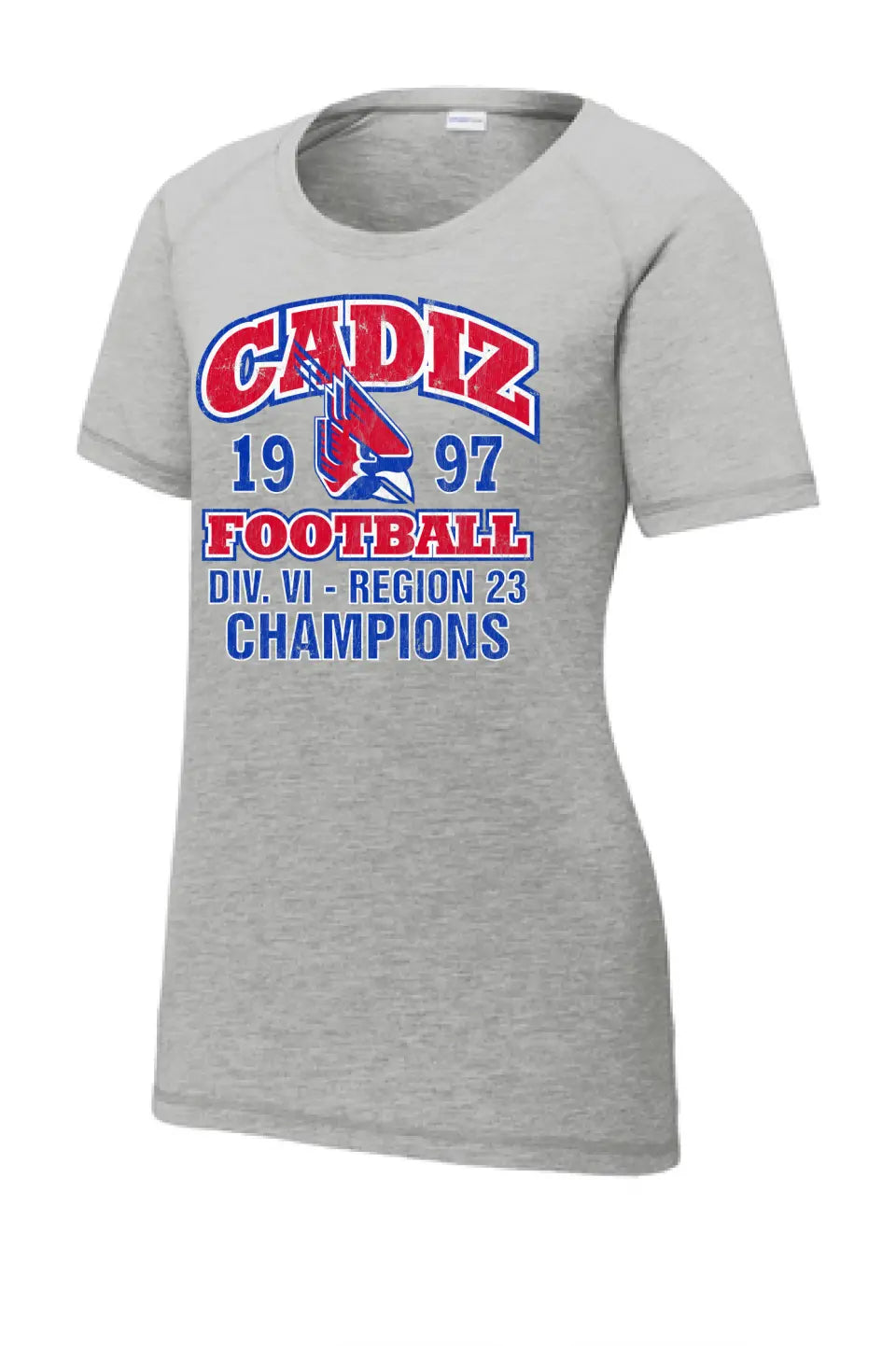 Cadiz Cardinals 1997 Football Region 23 Champs Ladies PosiCharge Tri-Blend Wicking Scoop Neck Raglan Tee