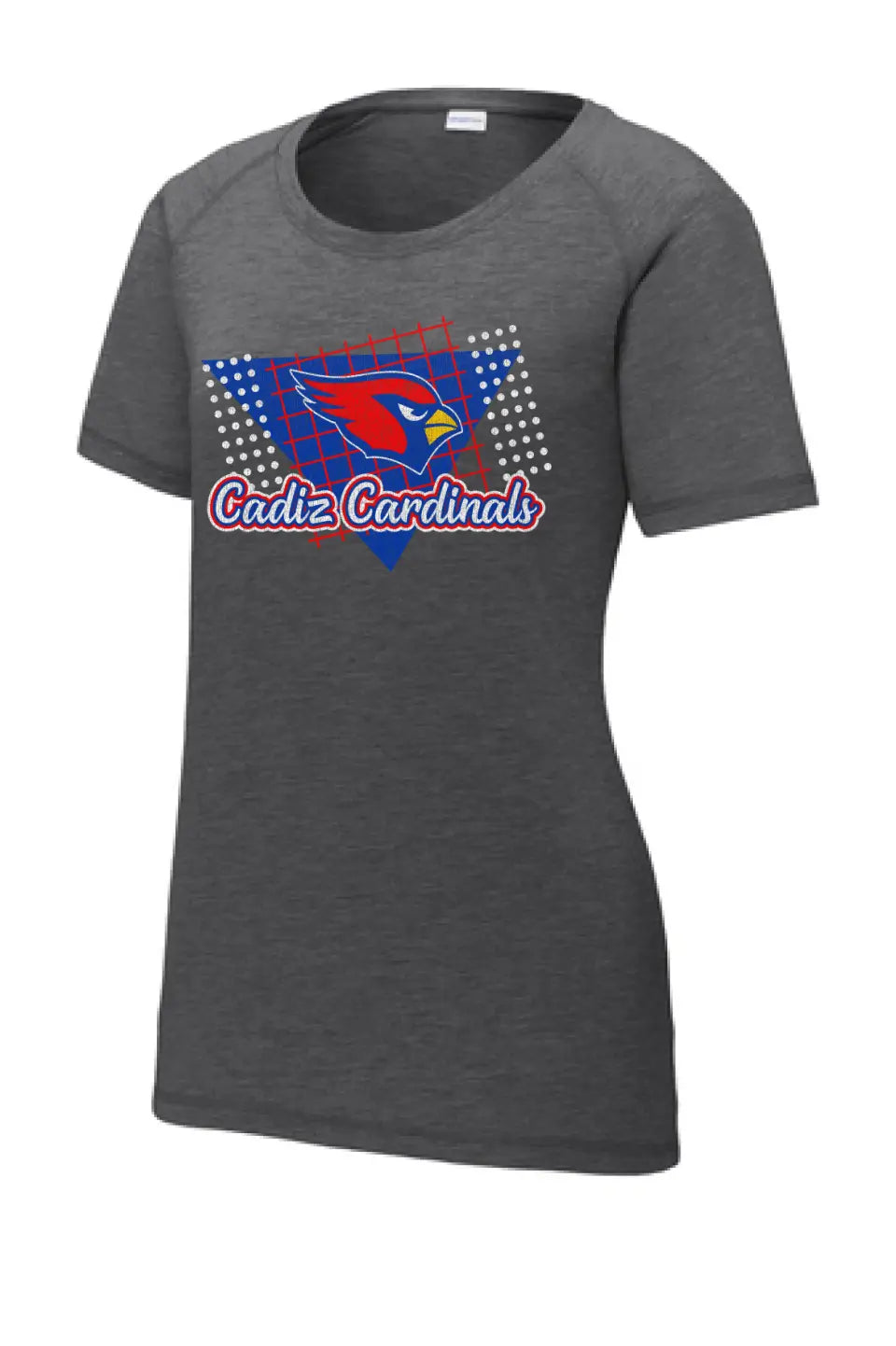 Cadiz Cardinals Distressed 80s Ladies PosiCharge Tri-Blend Wicking Scoop Neck Raglan Tee
