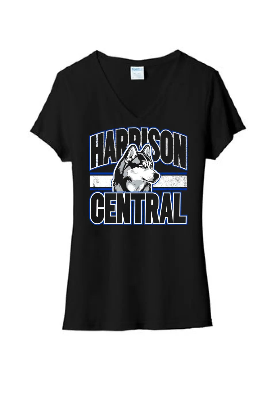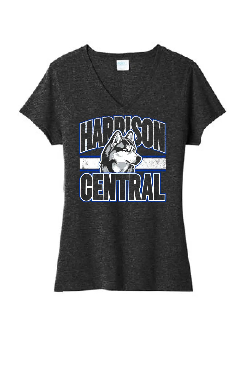 Harrison Central Husky Dog Arch Distressed Ladies Tri-Blend V-Neck Tee
