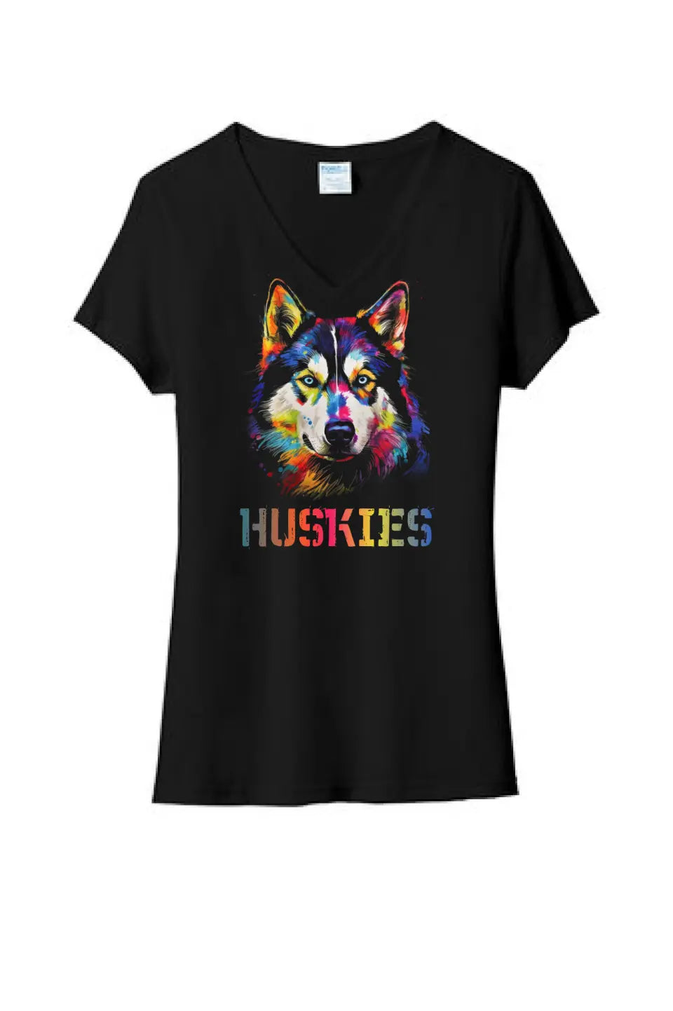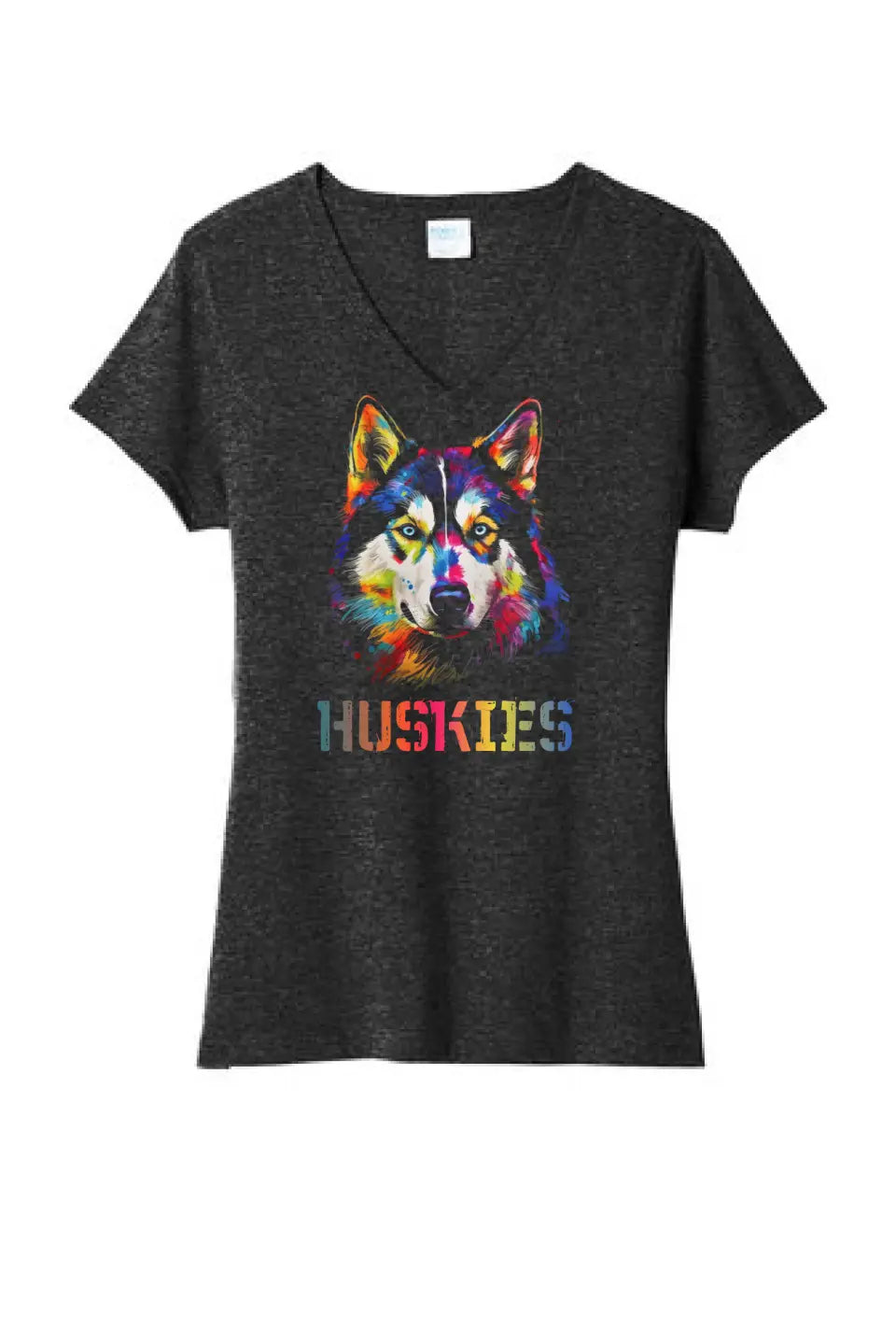 Harrison Central Husky Dog Rainbow Colors Ladies Tri-Blend V-Neck Tee