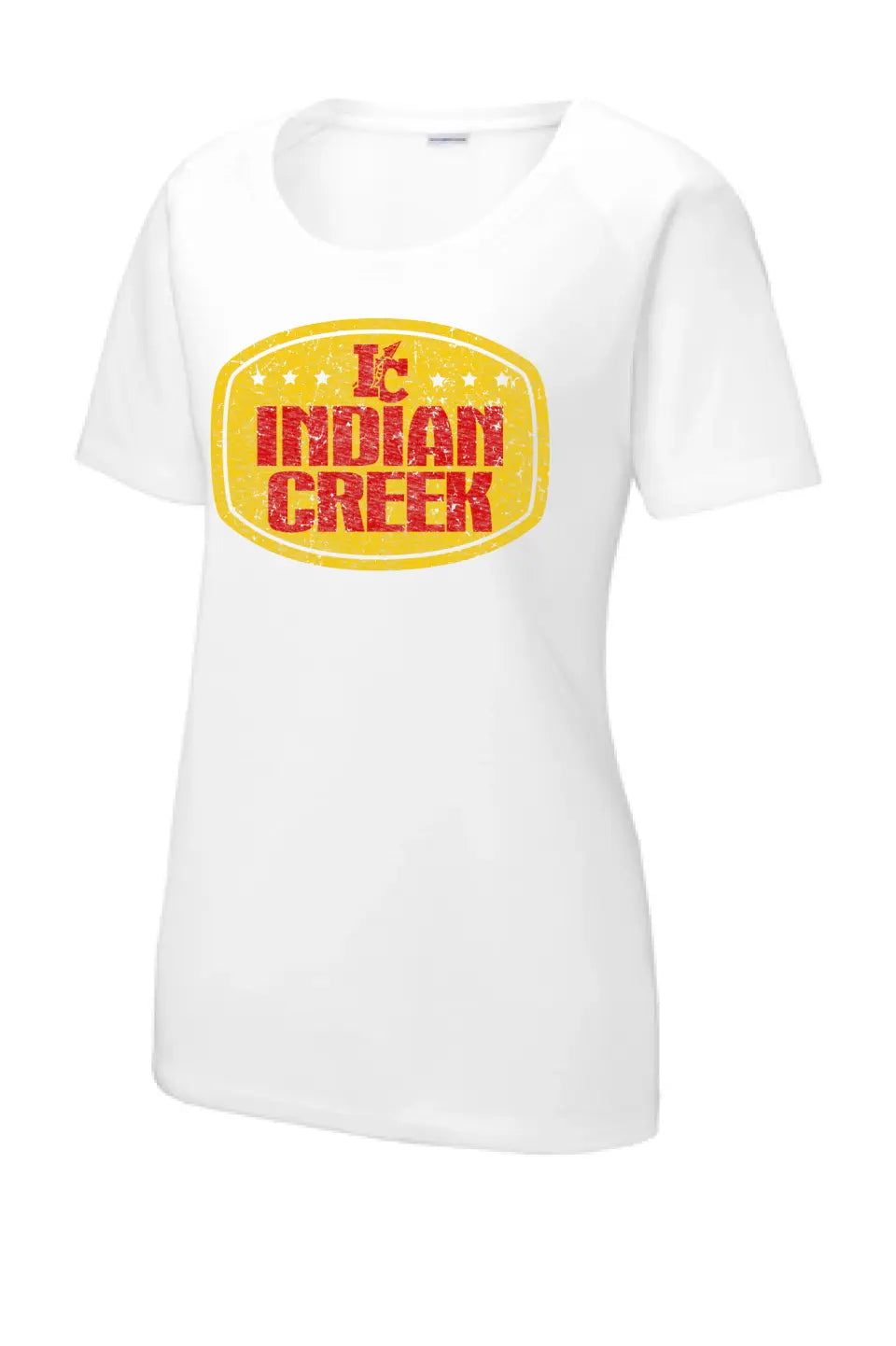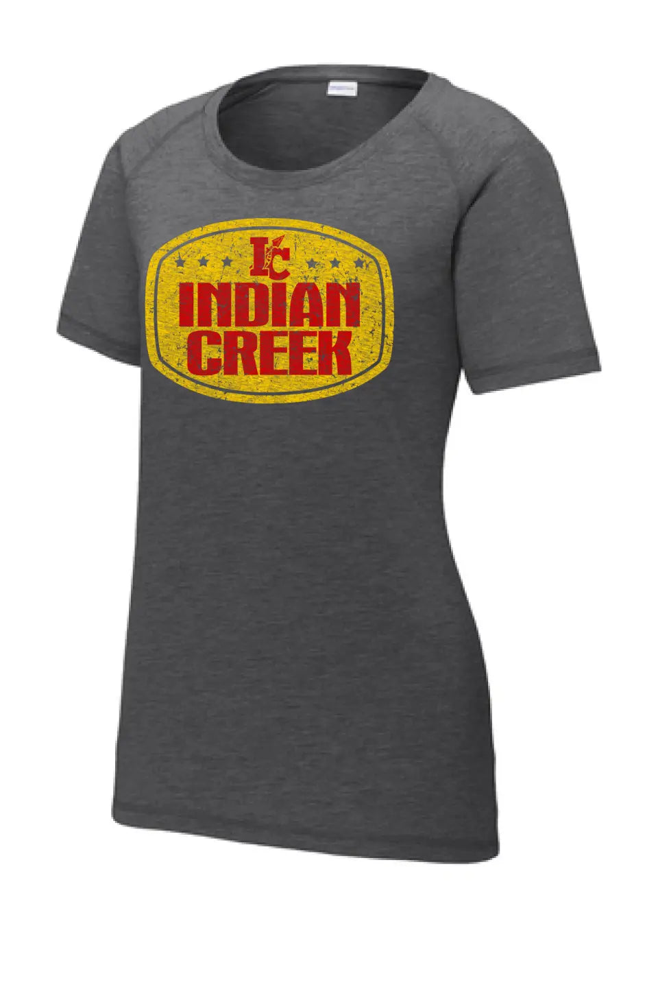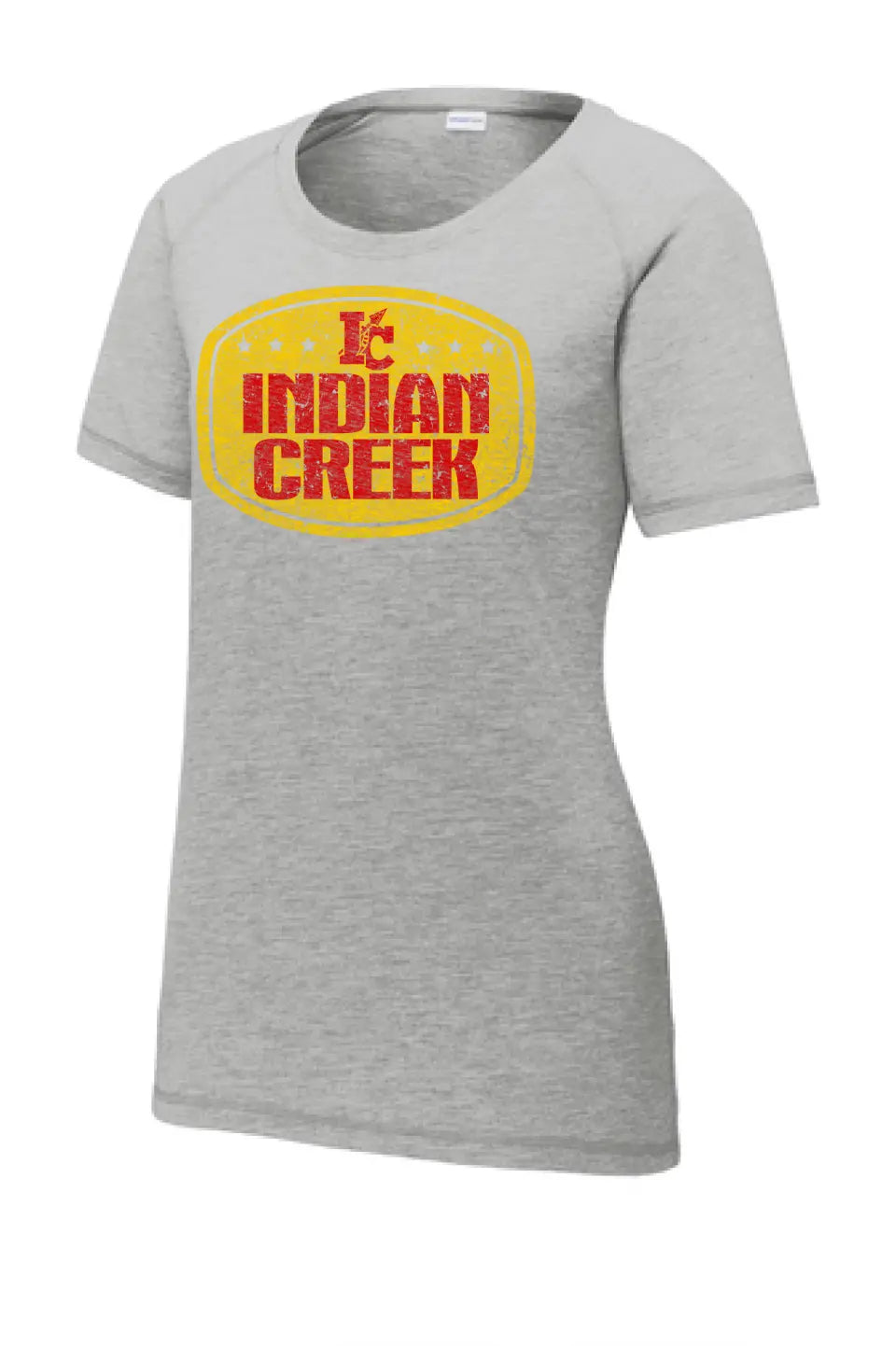Indian Creek Distressed Badge Ladies PosiCharge Tri-Blend Wicking Scoop Neck Raglan Tee