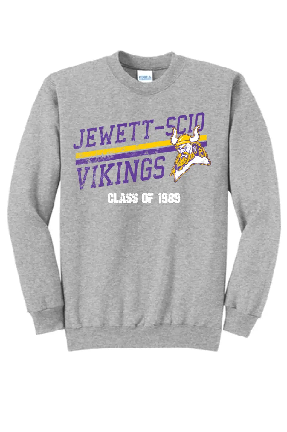 Jewett-Scio Vikings Rising Custom Graduation Year Distressed Design on Grey Core Fleece Crewneck Sweatshirt