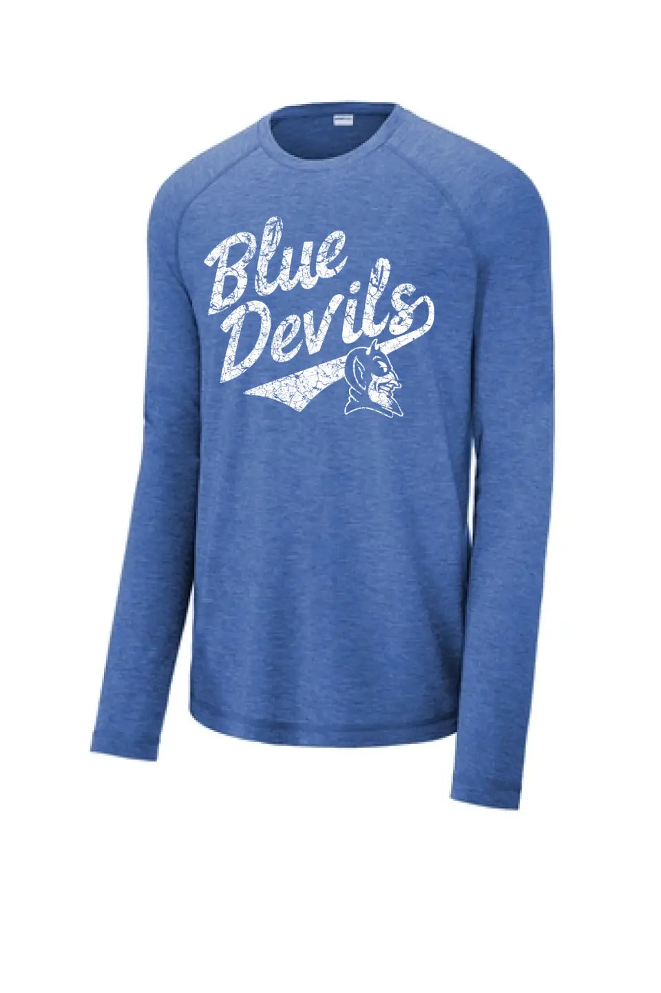Lisbon Blue Devils Script Distressed Long Sleeve Tri-Blend Wicking Raglan Tee