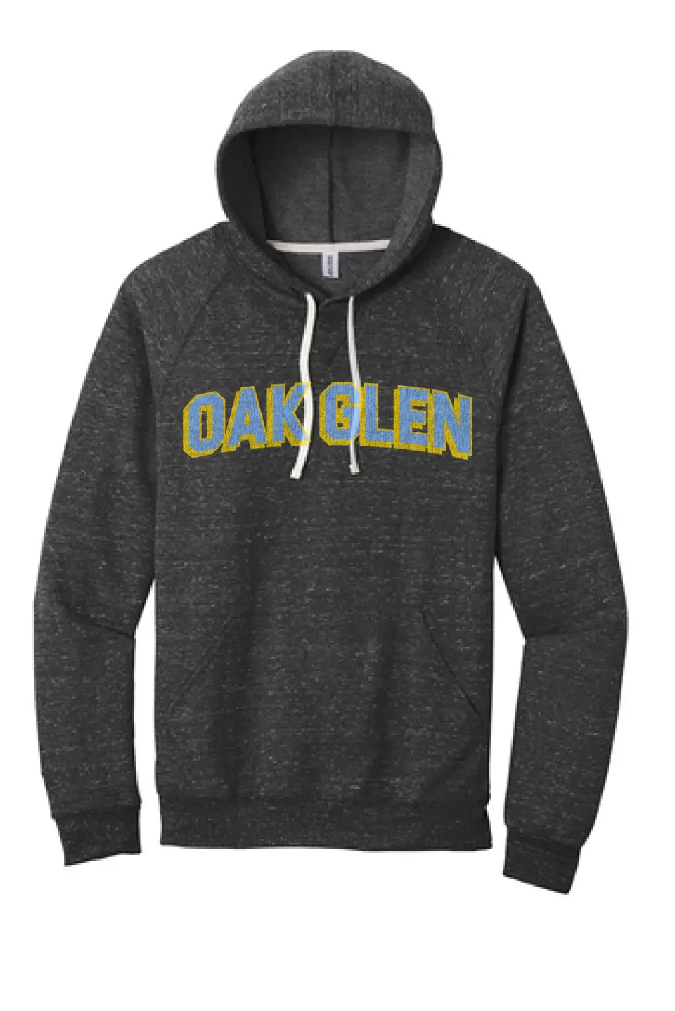 Oak Glen Distressed Letters Snow Heather French Terry Raglan Hoodie
