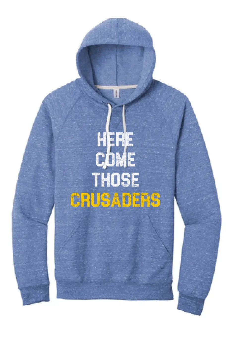 Steubenville Catholic Central Distressed Here Come Those Crusaders Jerzees Snow Heather French Terry Raglan Hoodie